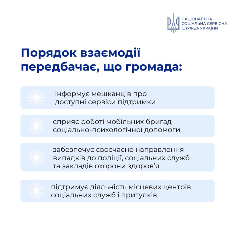 ідповідно до Закону України «Про запобігання та протидію домашньому насильству» органи місцевого самоврядування та структурні підрозділи, відповідальні за реалізацію державної політики у сфері соціального захисту населення, зобов’язані створювати безпечне середовище для мешканців, своєчасно реагувати на звернення постраждалих осіб та координувати надання комплексної допомоги.