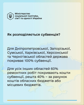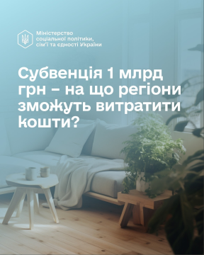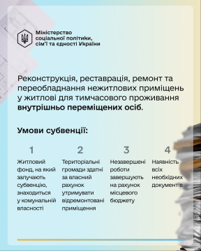 Міністерство соціальної політики, сім’ї та єдності розробило порядок надання 1 млдр субвенції із державного бюджету для реконструкції, реставрації, ремонту та переобладнання нежитлових приміщень у житлові для проживання людей, які вимушено покинули свої домівки.