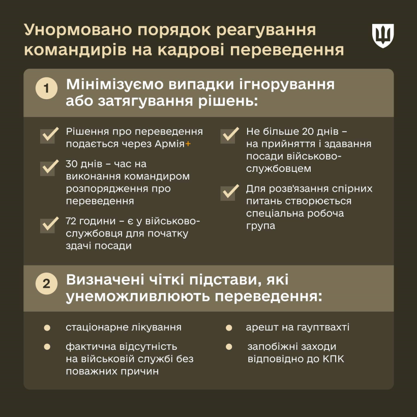 Унормовуємо порядок реагування командирів на кадрові переведення. Мінімізуємо випадки ігнорування або затягування рішень.