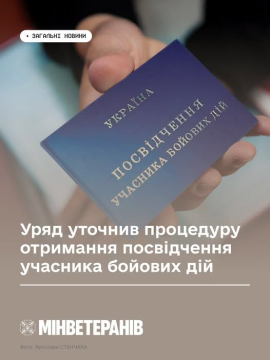 Кабінет Міністрів України ухвалив постанову, розроблену Міністерством у справах ветеранів, якою уточнюються процедури отримання посвідчення учасника бойових дій та отримання даних з Єдиного державного реєстру ветеранів війни і робить їх більш зручними для ветеранів, ветеранок та їхніх родин.